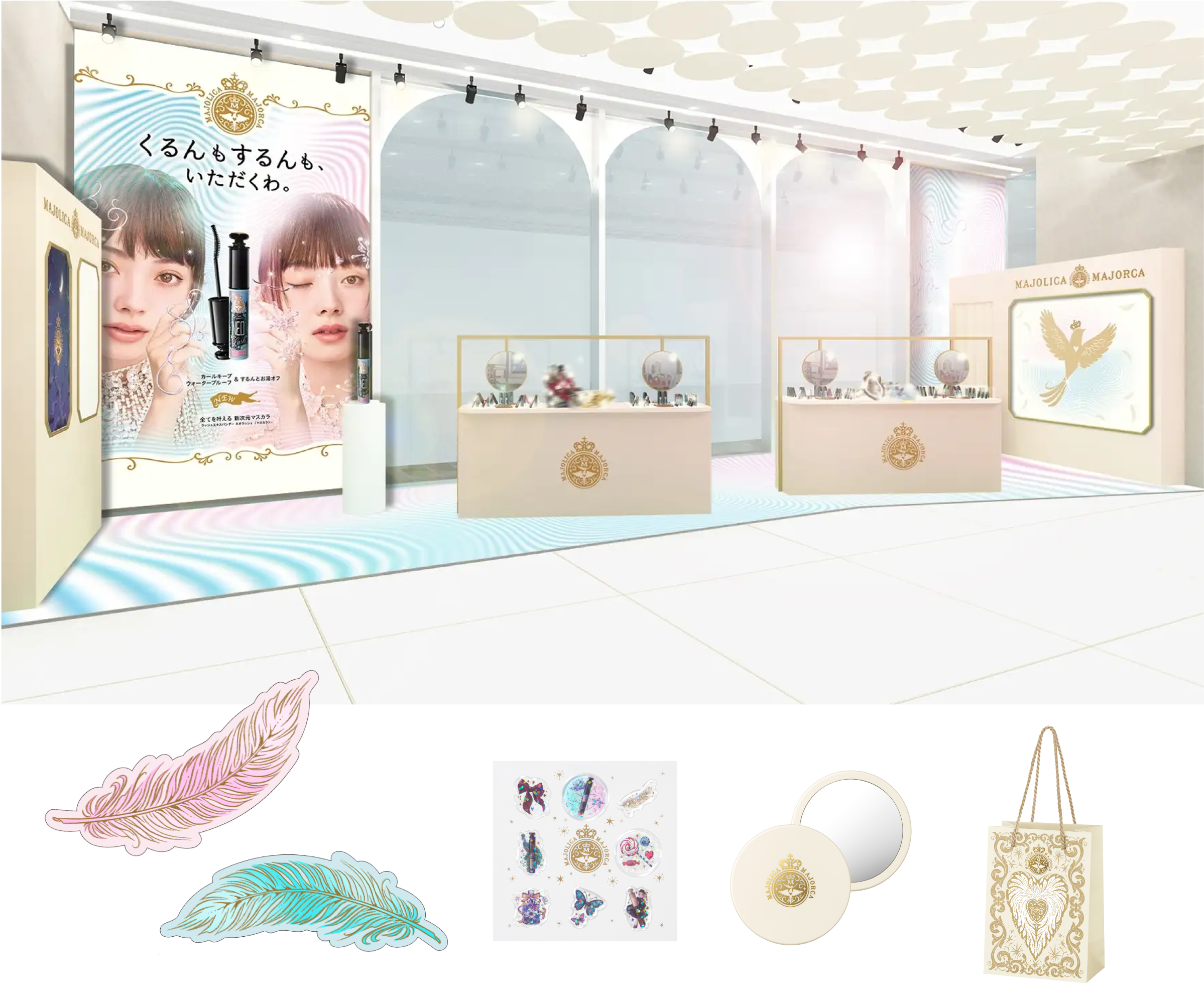 商品を実際に体感できるスペースに加え、ブランドの世界観を体感できるミッションスペースや、ブランドストーリーに登場するマジョリカバードの羽根を来場者が華やかに飾っていくことで完成するなど、参加型の構成にしました。参加を促すアイテムとしてPOPUP限定の特典グッズの制作もしました。