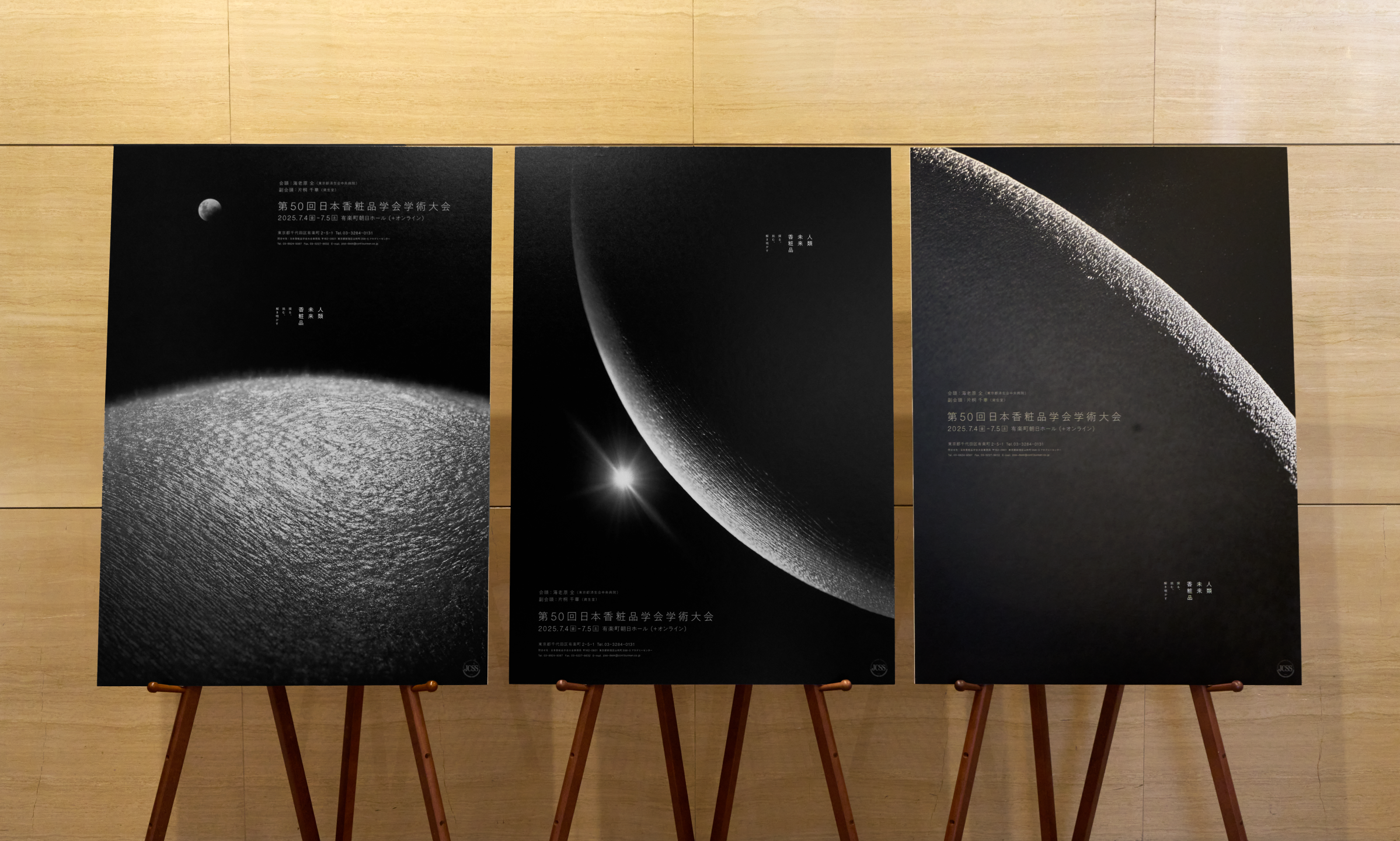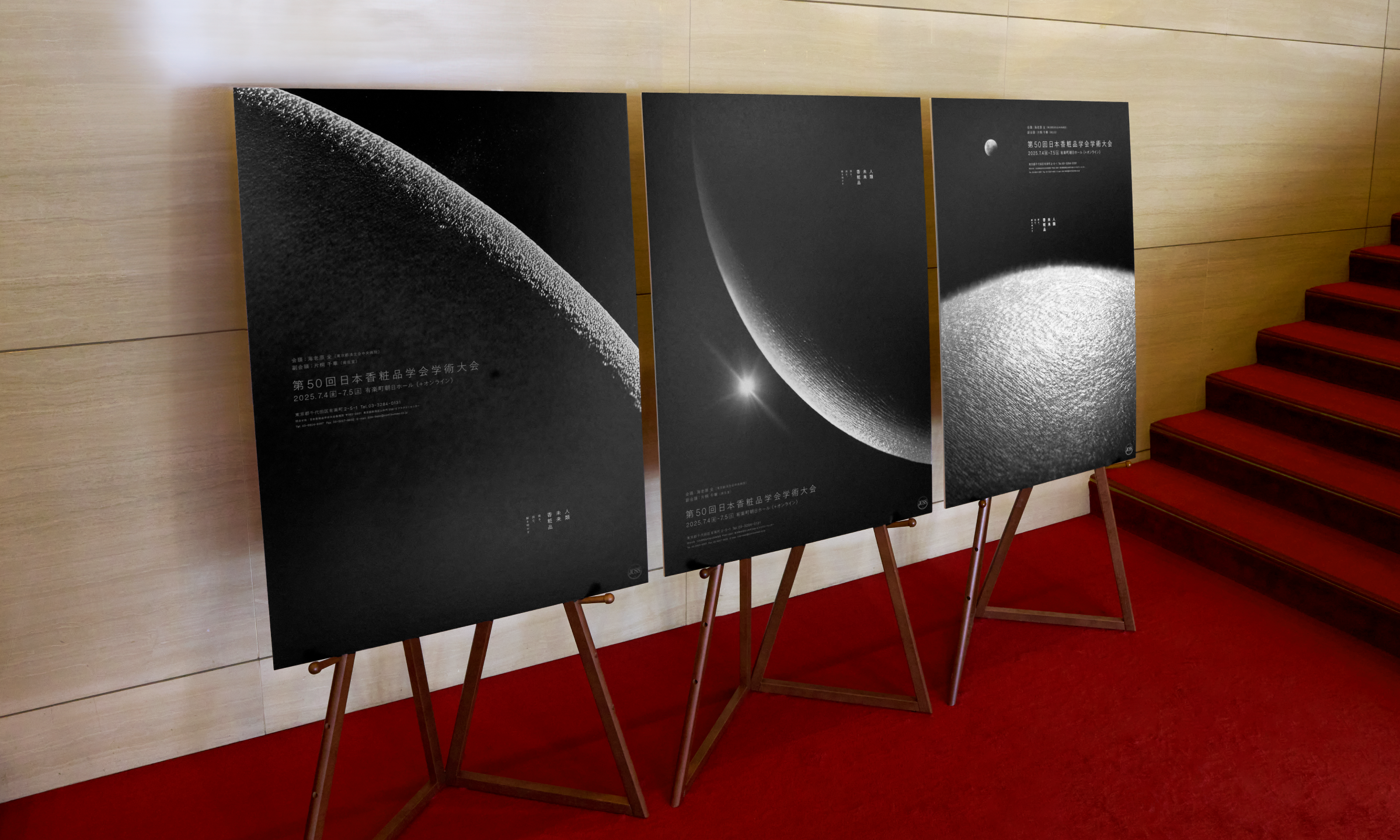 今年で50 周年を迎える日本香粧品学会学術大会。そのテーマ策定とキービジュアル制作を資生堂クリエイティブが担当しました。皮膚科医、薬学などの研究者、事業会社の化粧品研究者から業界をめざす学生たちまで、幅広い分野の人々が集う産官学の学術大会。第50 回となる今回、香粧品がもつ限りない可能性に向け、「人類、未来、香粧品」というテーマを策定。キービジュアルでは人類が挑み続ける宇宙探索をモチーフに。実際の肌を撮影し広大な宇宙空間に見立てたビジュアルを創りました。